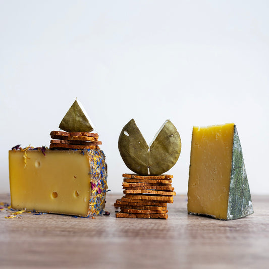 Every month we hand-select four cheeses from seasonal favourites to those that we have ripened to perfection, plus crackers to partner them.